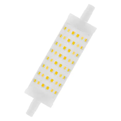 Ledvance LED Line R7s double Ended 118mm 15W 2000lm - 827 Blanc Très Chaud | Dimmable - Équivalent 125W est une ampoule tubulaire linéaire à double extrémité. Ce type d’ampoule permet de délivrer une lumière homogène à 360° avec comme température de couleur 2700K - Blanc Très Chaud. Cette ampoule LED R7s de chez Ledvance est la solution idéale pour le remplacement de vos anciennes ampoules halogènes. Cette ampoule LED n’a pas besoin de transformateur, elle fonctionne avec 230V et peut se connecter directement sur le secteur électrique.