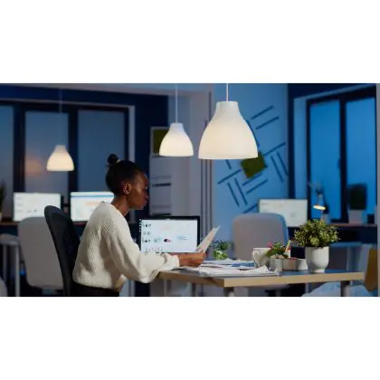 Le rapport lumen/watt (lm/W) indique l'efficacité avec laquelle une source lumineuse convertit l'énergie en lumière. Pour cela, on divise le nombre de lumens par le wattage. Plus le chiffre est élevé, plus le produit est efficace en termes de consommation d'énergie. L'éclairage LED présente un rapport lumen/watt nettement supérieur à celui de l'éclairage classique.